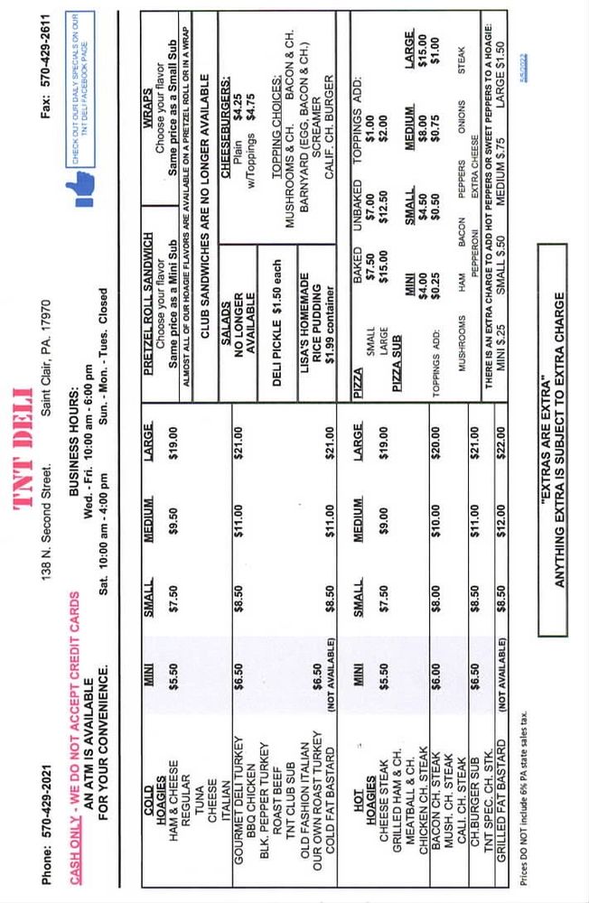 Introducing TNT Deli, located in Saint Clair, PA, a hidden gem for deli lovers. Known for their massive subs filled with top-quality meats like roast turkey and Boar's Head selections, TNT Deli offers a unique experience reminiscent of classic South Philadelphia hoagies. Customers rave about the fresh, flavorful ingredients, especially highlighting the Cheesesteak and Black Pepper Turkey subs as must-tries. The generous portion sizes make it a great value, with many patrons finding one sub enough to feed multiple people. While prices have slightly increased, the quality and quantity of the food more than justify the cost. The only downside is that TNT Deli is cash-only. Overall, TNT Deli provides a nostalgic and satisfying deli experience that is sure to leave you planning your next visit.